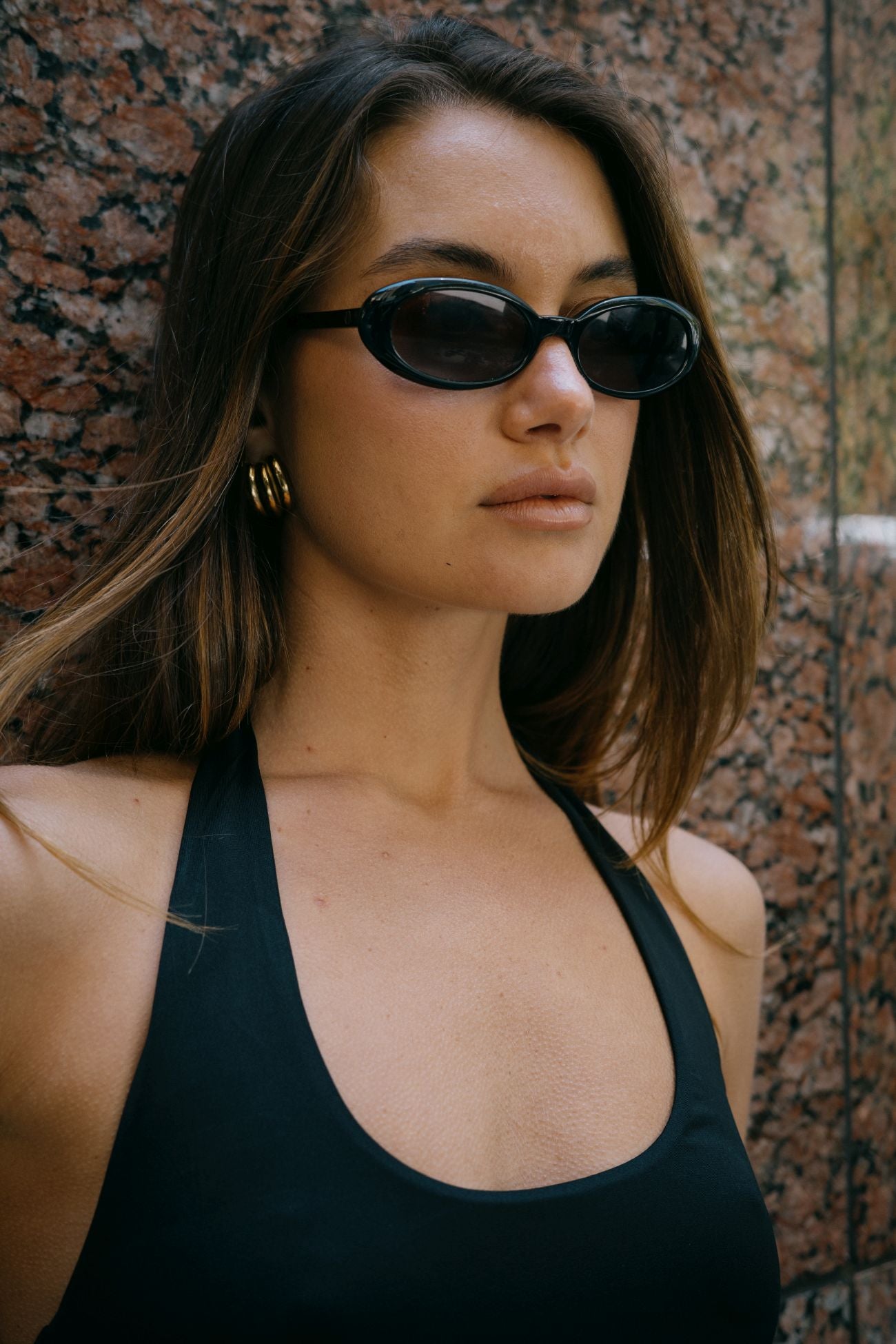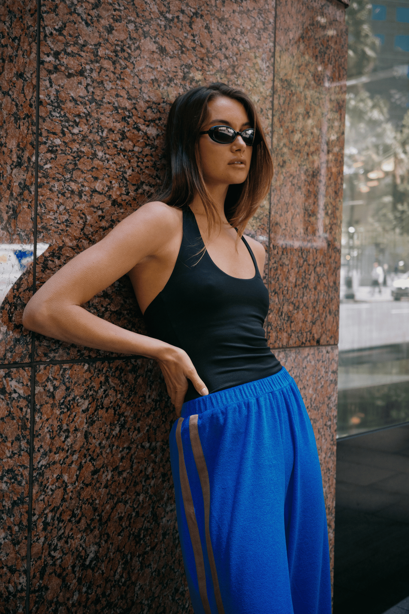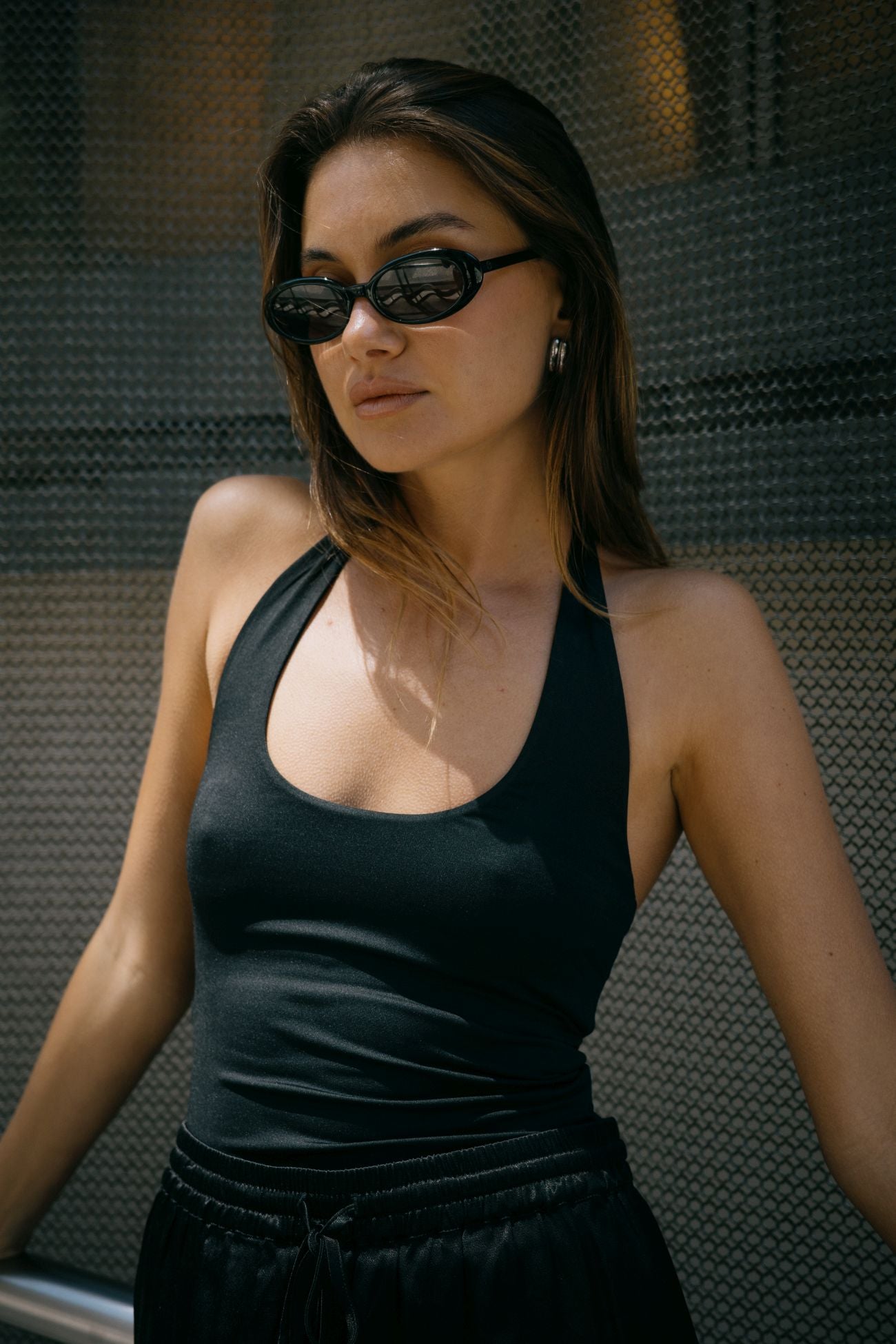 The Tessa Halter Tank in black is a stylish and sleek silhouette. Featuring a scooped halter neck and an elegant open back. This versatile piece is made from soft, figure-skimming fabric that transitions seamlessly from day to evening. The fully lined front provides structure and support, while the built-in crop top combines design with functionality.