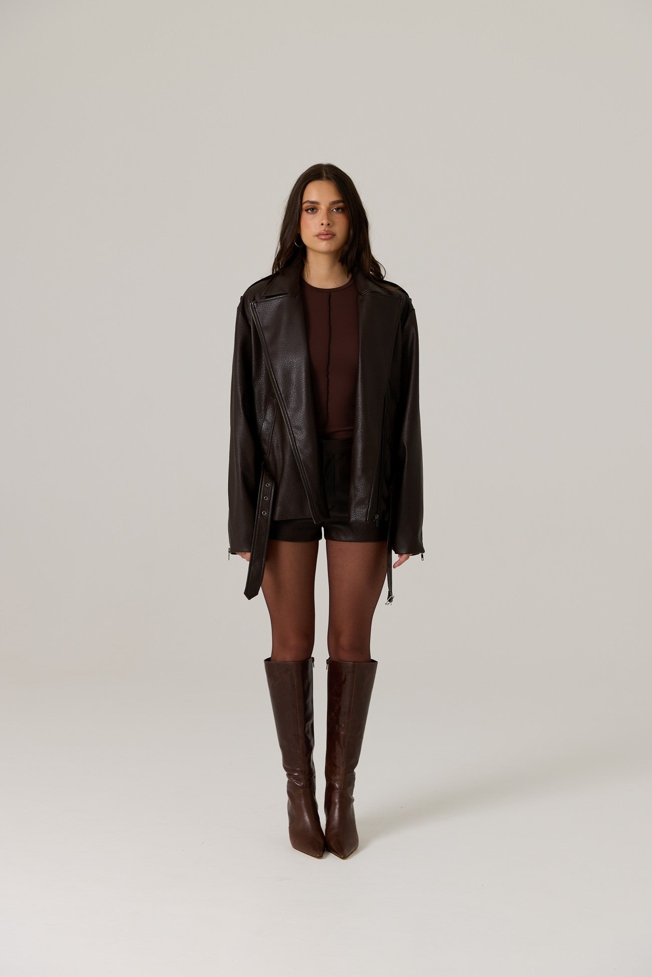 The Berkley Vegan Leather Biker Jacket in Dark Truffle is bold, structured and intentionally oversized. A modern rework of the classic biker silhouette, it blends attitude with elevated minimalism - finished in a rich Dark Truffle tone that feels warmer and more directional than black.